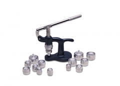 This tool offers the best of both worlds - price and quality. Made of metal with multiple dies, this crystal press/case closer is the perfect tool for snap-back cases. You'll have enough leverage to properly close the back, and enough control to make the proper fit. The hollow dies allow fitting without damaging the crystal or bezel. It is recommended to put a soft cloth between the bezel and die so that no marring can occur. 28 piece set.