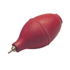 Small dust blower measures 3-3/4" x 1-3/4". Made from red rubber with a plastic sheathed nozzle. Weighs 2 ounces.