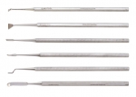 Made of high-grade, non-rust, non-corrosive, stainless steel this set features all new shapes that cut or scrape wax the way you need to. Ergonomic shapes give the user the ability to get into tight places, at the correct angles for nooks and corners. Handles are non-roll octagonal and cross-grooved for a firm but pleasant grip. Heads feature sharp edges to cut properly, eliminating additional smoothing. Set includes 90degrees small and large flat, 30degrees angled, sharp claw, chisel and scooper.