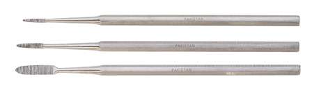 This 3pc (3 piece set includes small, medium and large points) Europoint Precision Carver Set has pointed tips for fine work. Features single cuts, which will not clog, yet leaves a smooth surface. Made of stainless steel with sure-grip handles, they are the only files of this type available today. 5-1/2" length.