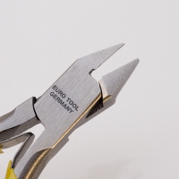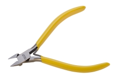 Our 4-1/2" (115mm) German cutter specifically designed for multi-strand beading wire is full-flush with pointed jaws induction hardened to 60-62 Rockwell. Used properly this degree of hardness assures a clean cut, time after time. Cutting edges are precisely aligned and the black oxide non-glare head has "relieved" design for reaching into tight areas. This quality German cutter also features double-leaf springs and yellow PVC handles. Use on flexible beading wire and soft wire only. 4-1/2" (115mm) long.